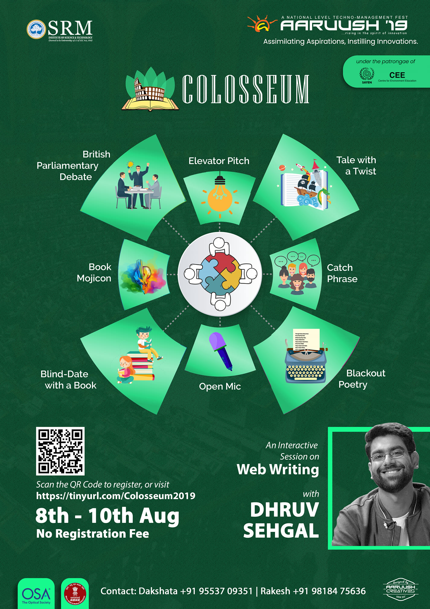 "It takes a great deal of history to produce a little literature", said Henry James. So come witness, as we attempt to make a little history with the latest edition of Colosseum, the literary battleground of Aaruush. Three days that include an interactive web writing session by Dhruv Sehgal, a Book Swap for you to engage with fellow bibliophiles, an Open Mic for you to express yourself as you slam and speak words that rhyme along with a plethora of events and competitions all with exciting prizes coming your way!
