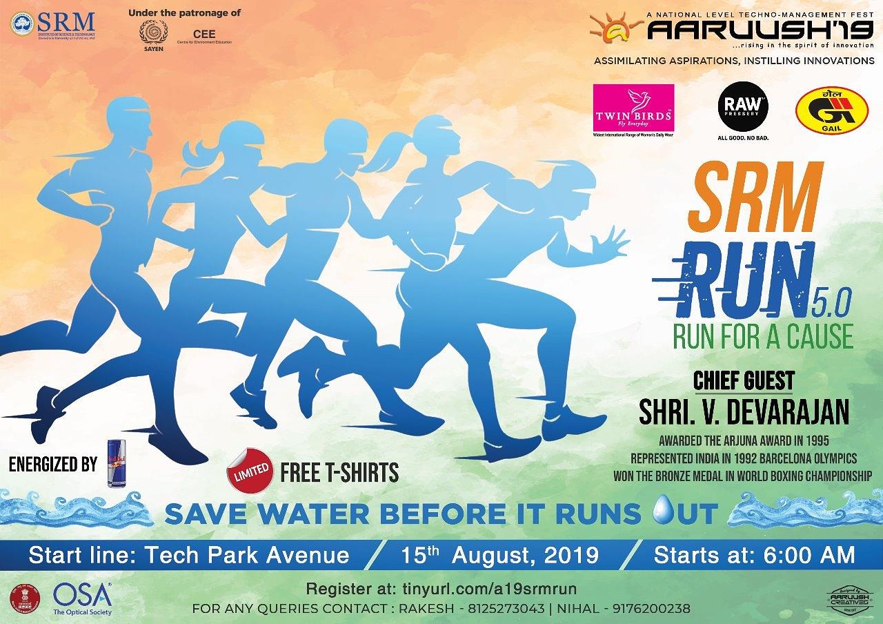 Running together, with a synced heartbeat, for one cause. Life depends on water, but the reservoir depends on us. With this thought in mind, Team Aaruush presents SRM Run, a 5 km long marathon on the 15th of August 2019, to spread awareness regarding the conservation of water. This Independence day, let's be patriots to mother nature. We hope to see you there, as we get together save water before we run out of it.
