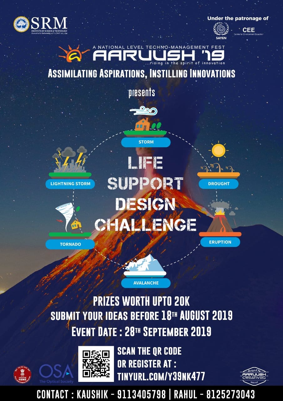 "With great power comes great responsibility" Not everyone's born a hero, some are remembered for their acts of kindness and bravery! With the world becoming prone to natural disasters, the human race requires a protector, or like Marvel says, "A Strike Team." To put forth new ideas of emergency life-support systems, team Aaruush presents the 'Life Support Design Challenge', a 3-Stage contest involving ideation and implementation of ideas to ensure the safe sustenance of life for the crucial hours following a disaster. Stage-1: Registration Deadline: 18th August, 2019 Register yourself for free along with a brief description of your idea to stand a chance for Stage-2 along with prizes worth ₹20K and an opportunity to implement your idea at a large scale for the betterment of humanity!