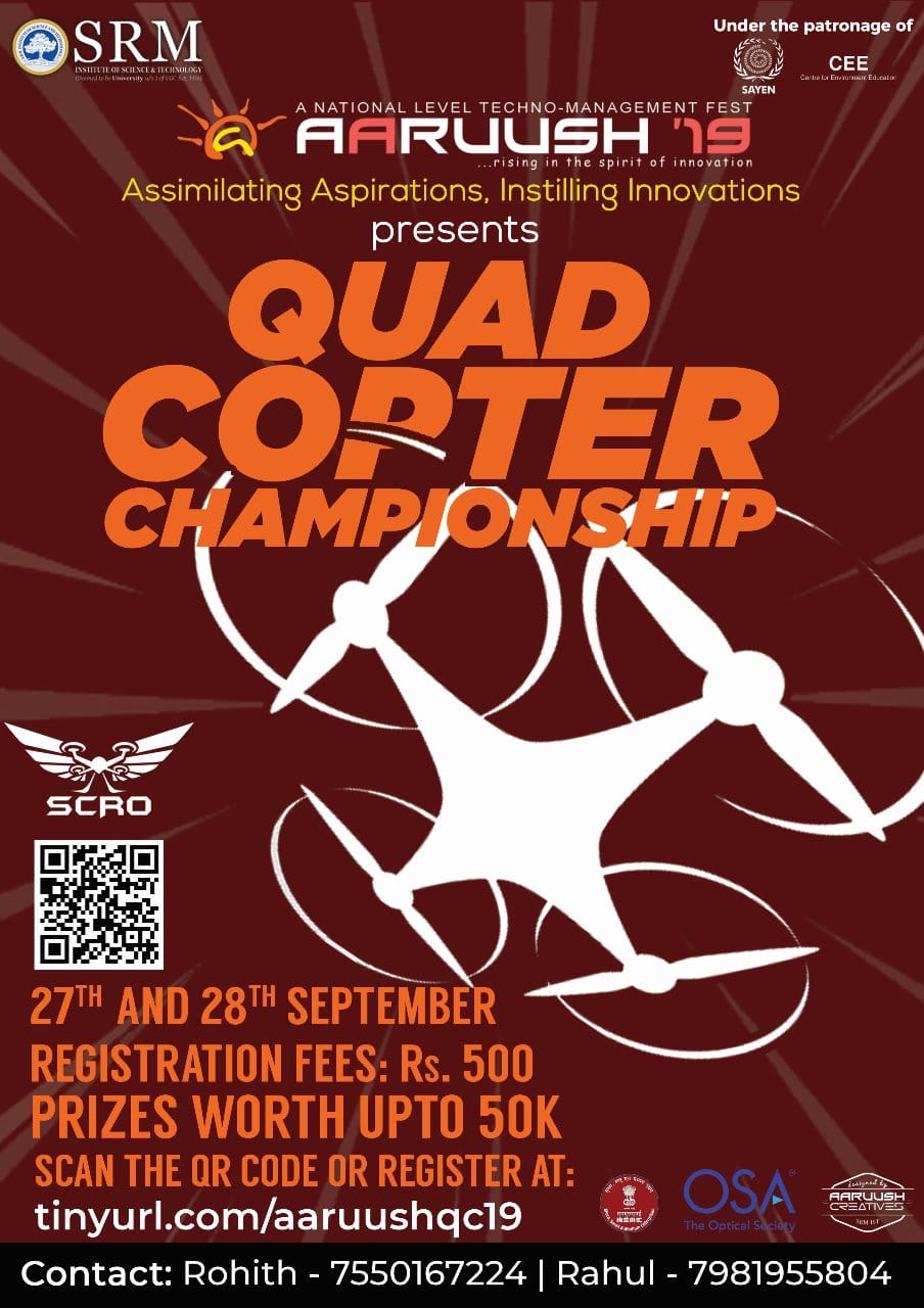 We've all witnessed the MARVELous Stark Industry drones create some crazy mind-boggling illusions in Spiderman: Far from Home. But now's the time to welcome them in our campus. Come and witness a cyclonic championship as Team Aaruush '19 presents to you Quadcopter Championship, where we're gonna take the level a lot higher, quite literally. Don't Wait! Register because sky's the limit.(read: arena).